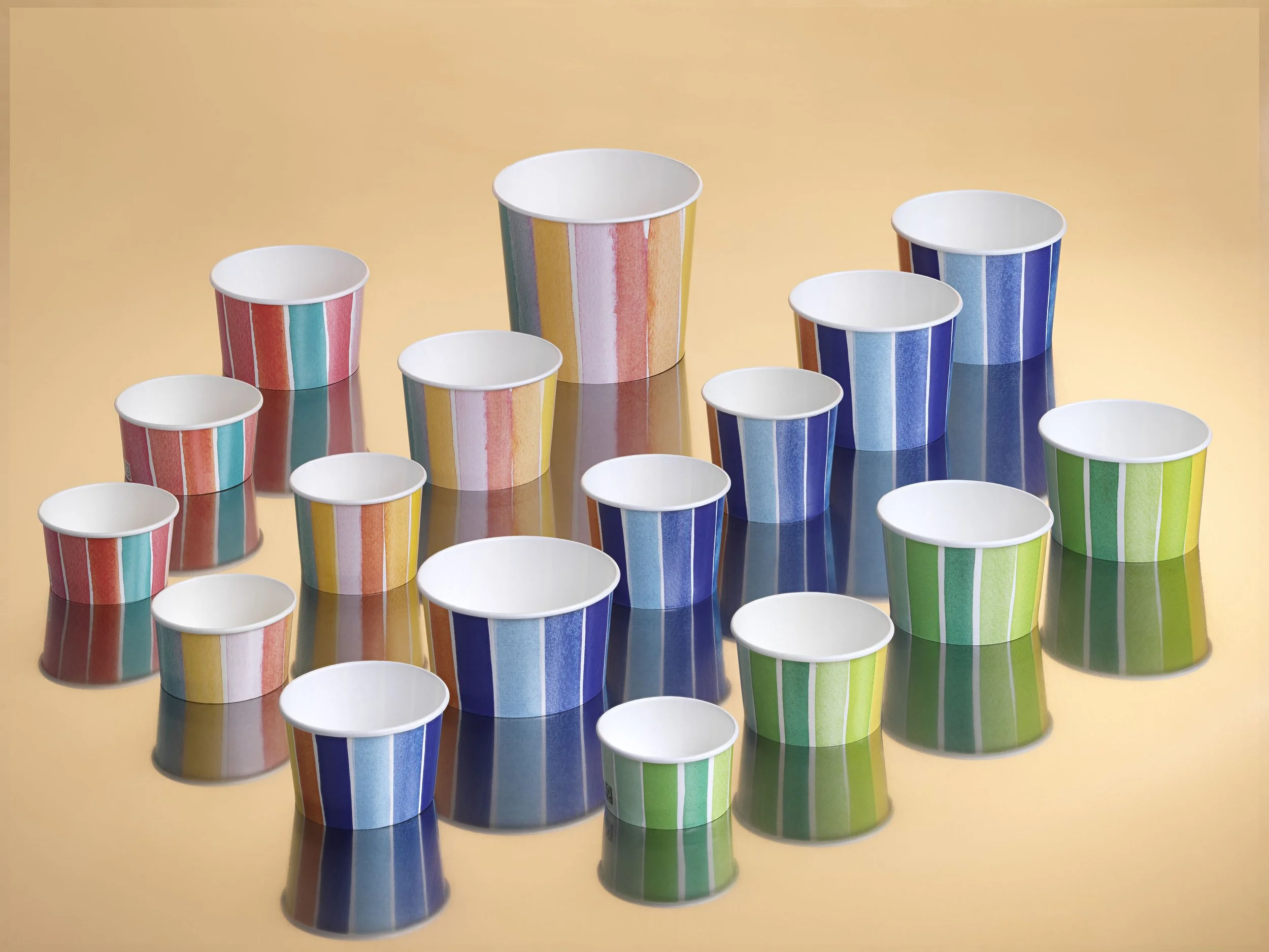 Un tocco artistico per esaltare ogni coppetta gelato: grandi pennellate di colore in acquerello decorano la superficie con eleganza e freschezza, trasformando un semplice contenitore in un’esperienza visiva unica. Questa grafica raffinata valorizza il prodotto, combinando bellezza e qualità, perfetta per gelaterie che puntano a offrire non solo gusto, ma anche stile.